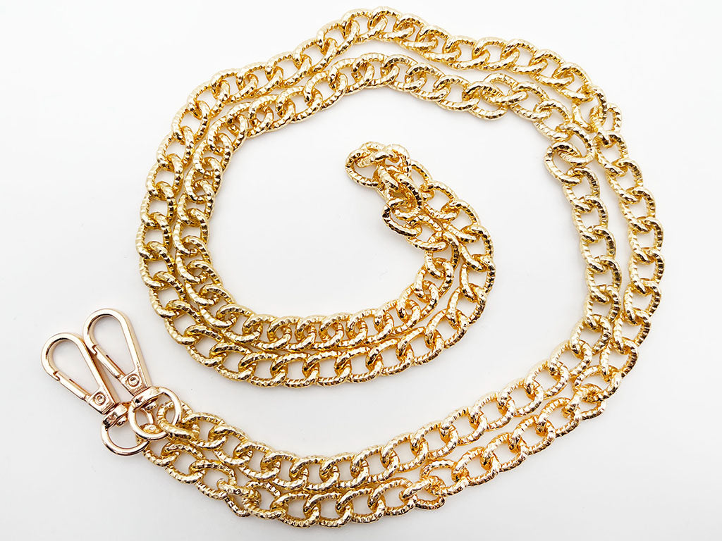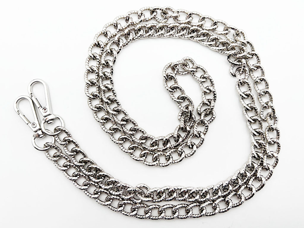 Catena in metallo con moschettoni da ambo i lati, lunghezza 110 centimetri, utile per realizzare nuove borse fatte a mano all”uncinetto. Misura delle maglie mm 14×10 ca. C11