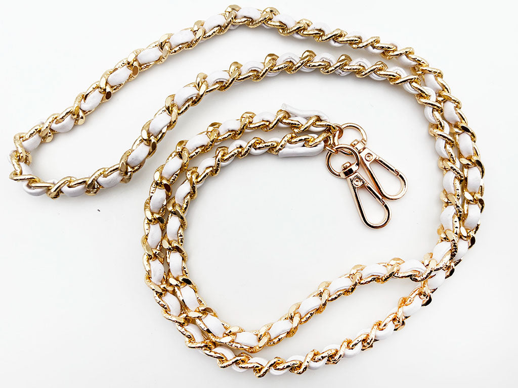 Catena in metallo con moschettoni da ambo i lati, lunghezza 120 centimetri, utile per realizzare nuove borse fatte a mano all”uncinetto. Misura delle maglie mm 12×8 ca. C05