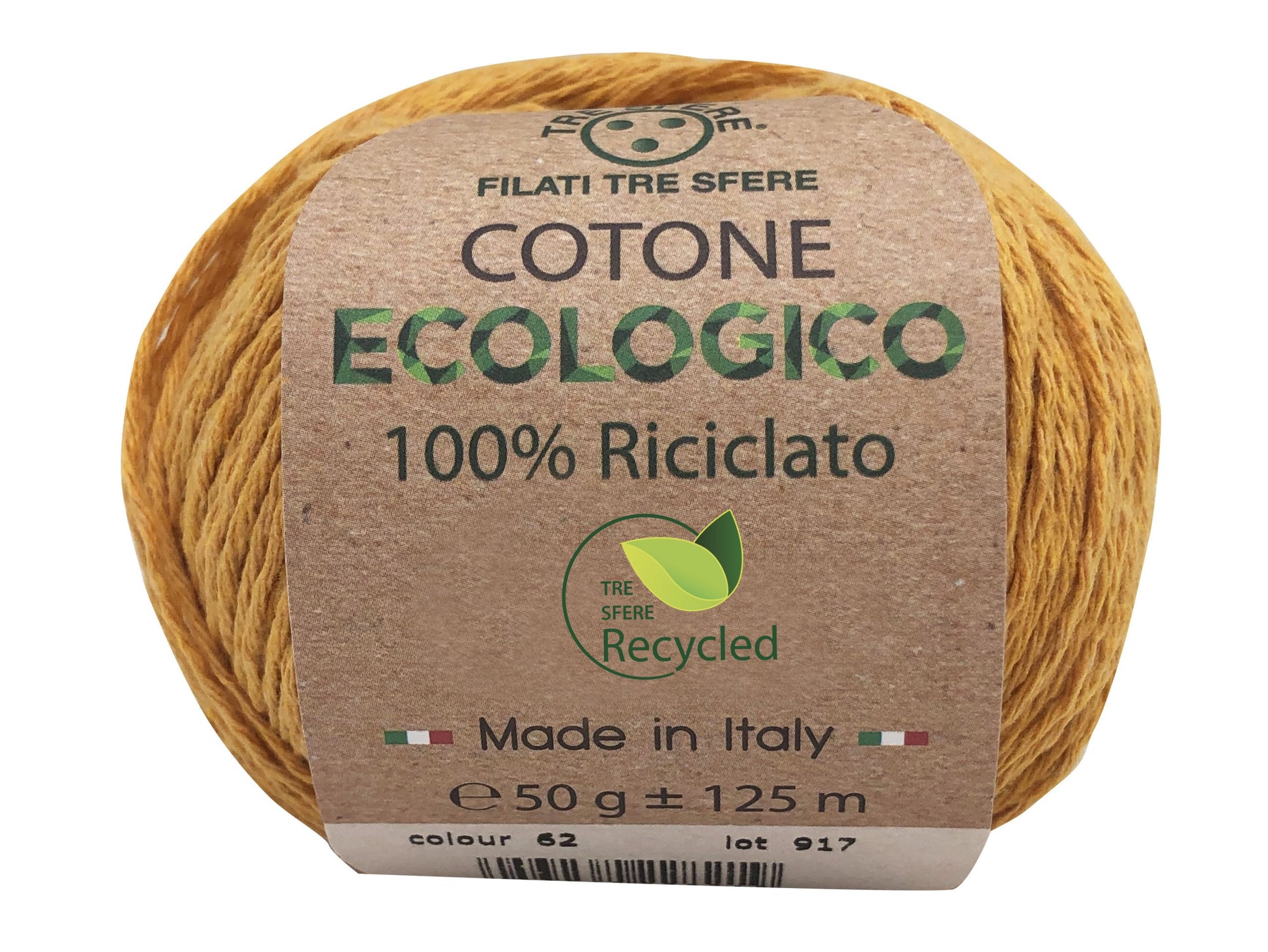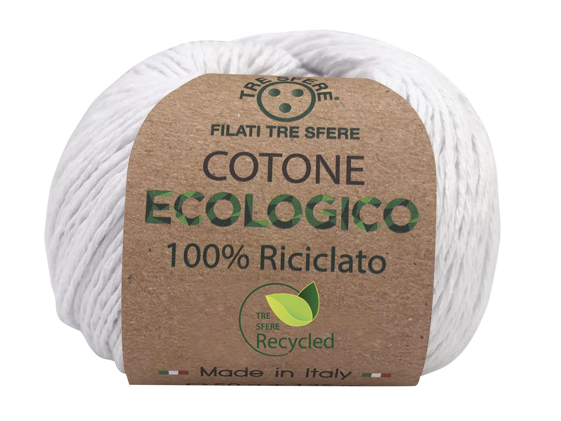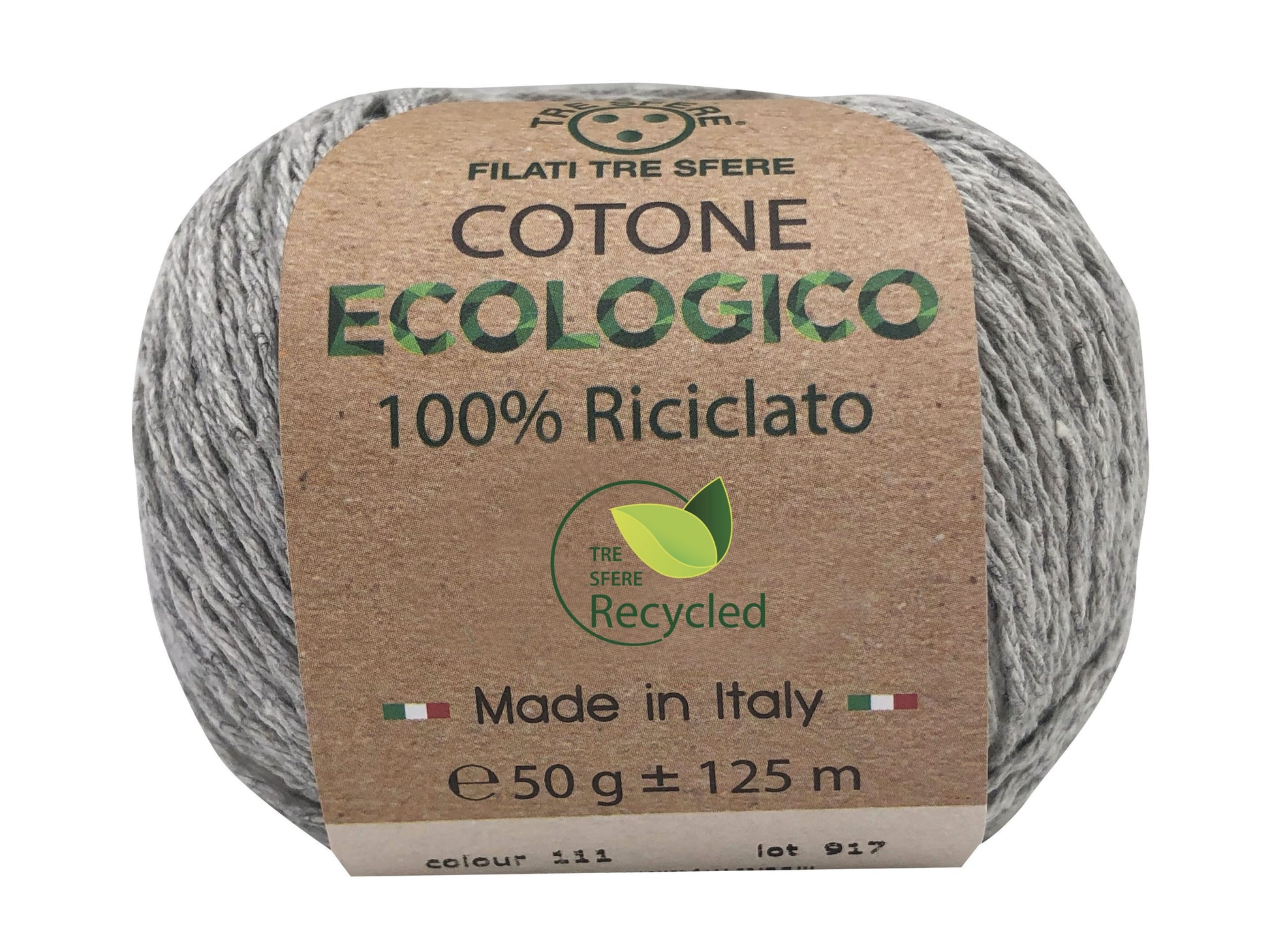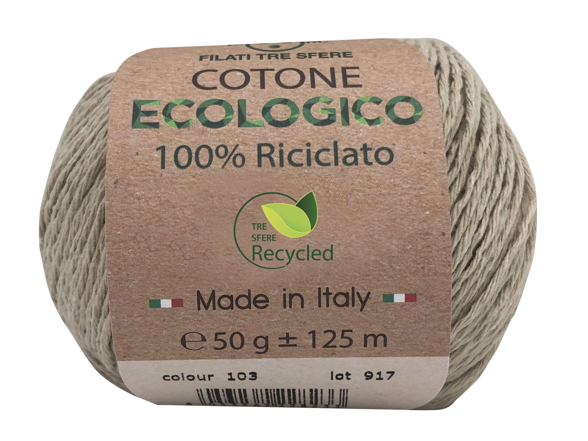 Cotone ecologico 100% riciclato, certificato oeko-tex®, soffice e versatile, gomitolo da 50gr. 125mt. uncinetto 2.5-3.5, 80% cotone 20% poliestere, made in italy, prodotto ritorto tinto e confezionato interamente in italia a biella
