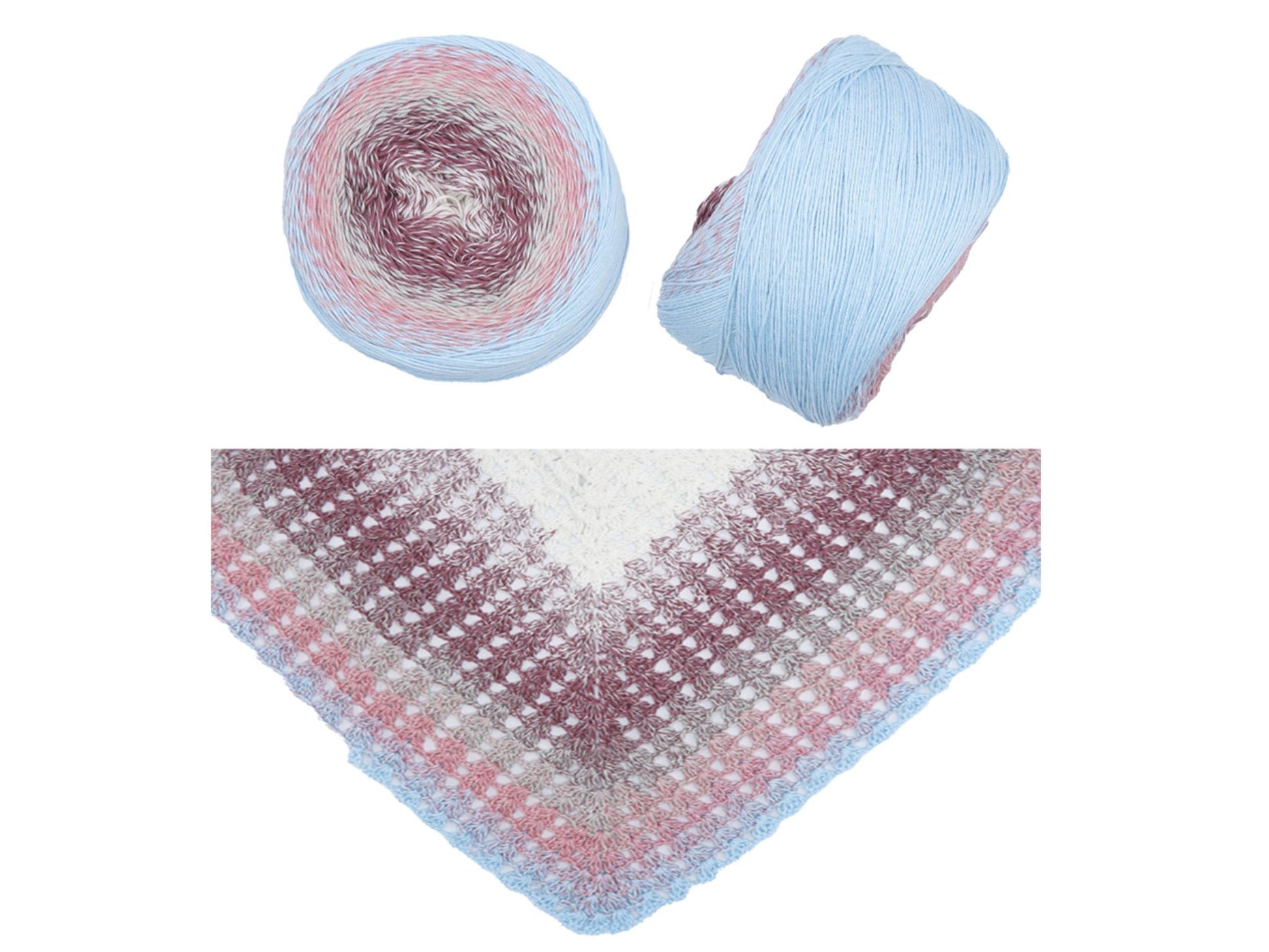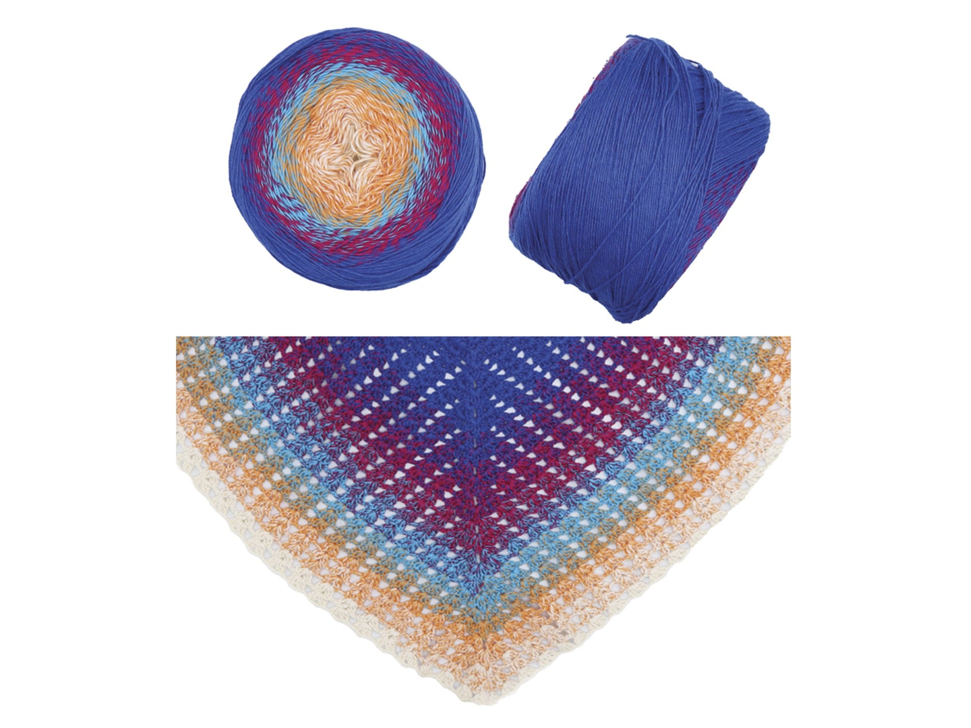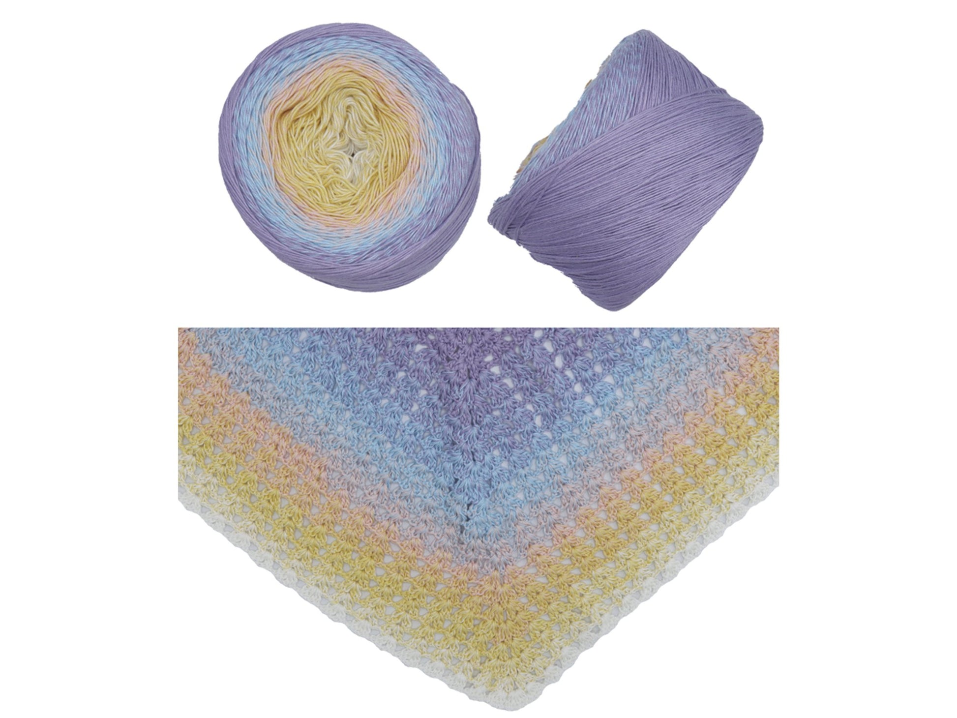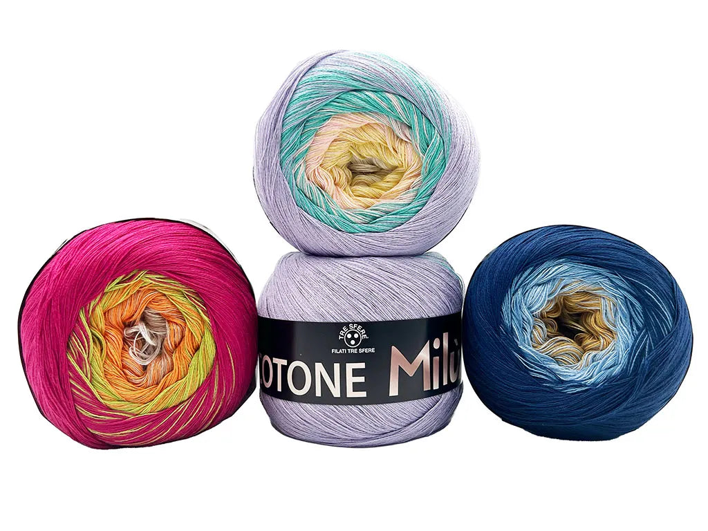 Cotone Milu, morbida cake con armoniosa sfumatura di ben 5 colori diversi, gomitolo da 150 grammi che sviluppa 600 metri, uncinetto 3mm. ferri 2,5mm, 55% cotone 45% acrilico, con una sola cake si possono realizzare scialle, borse, coprispalle, cardigan e maglie.