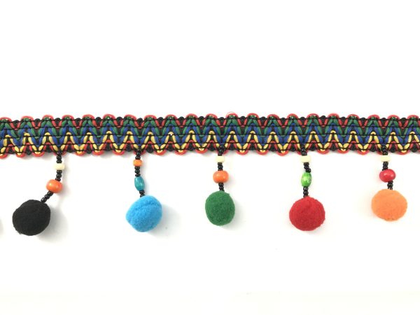 Frangia pallino moda multicolor arricchita da perline in legno – prodotto artigianale -pallino diametro: 17 mm. Confezione da 10 metri