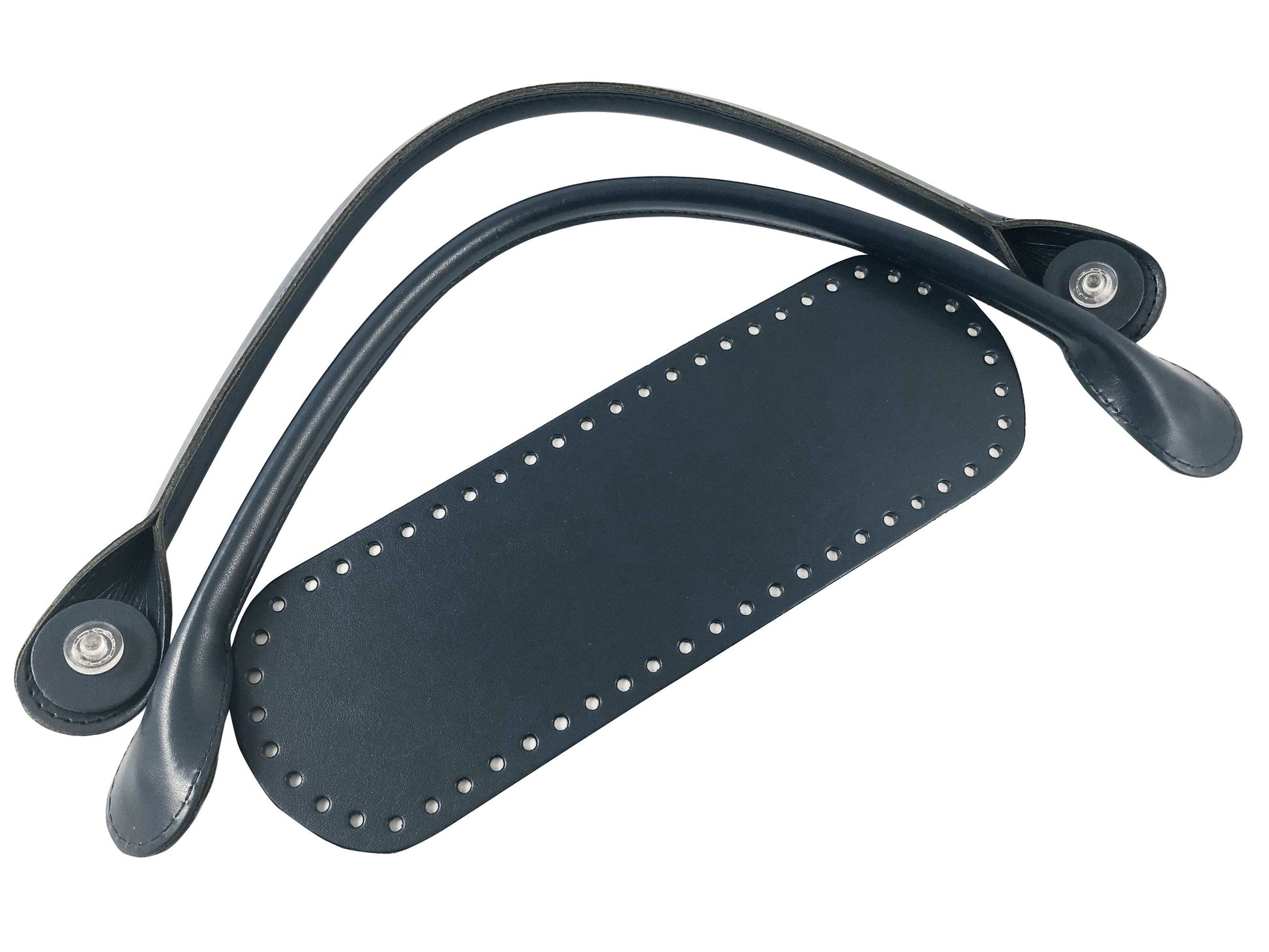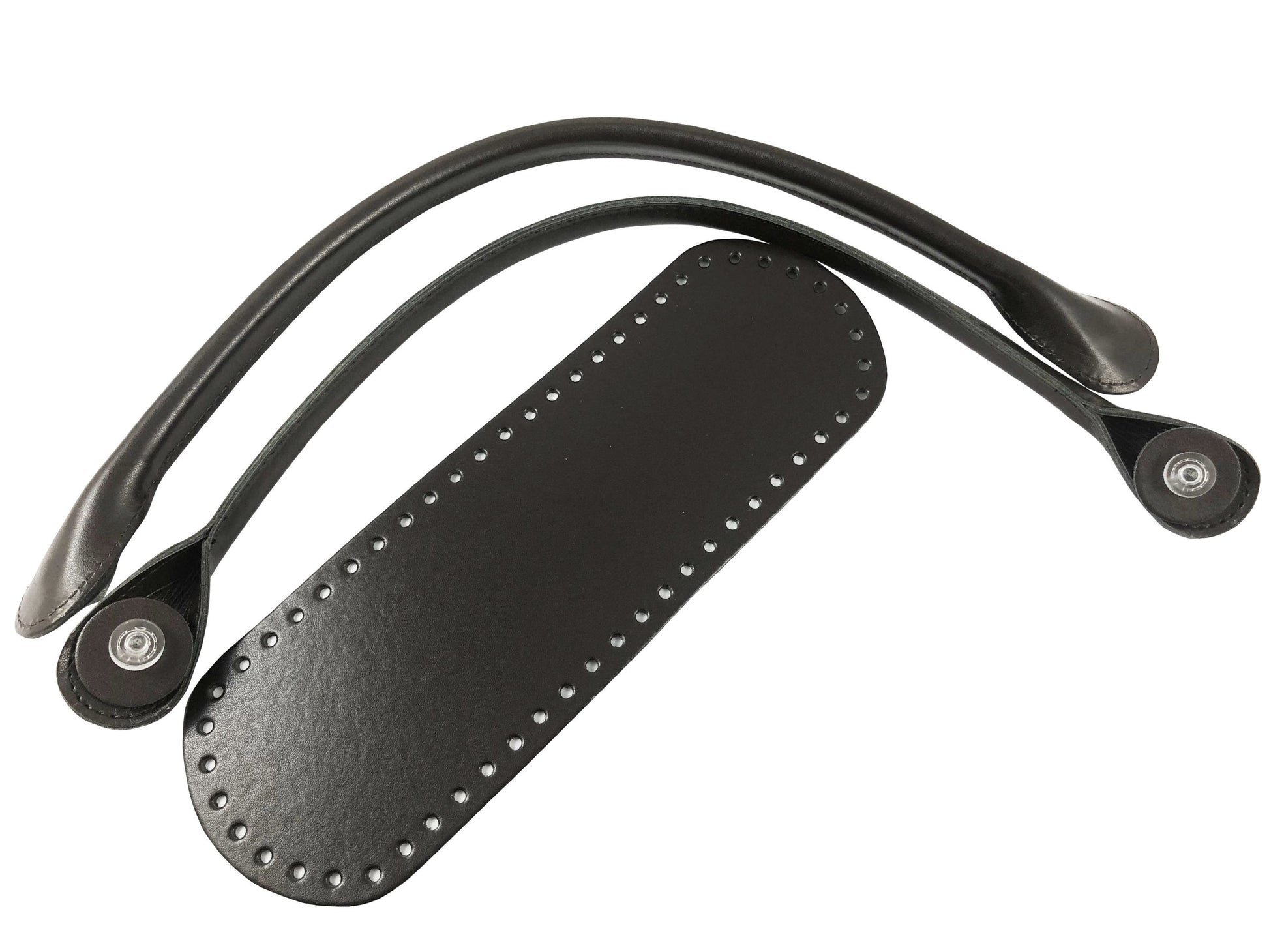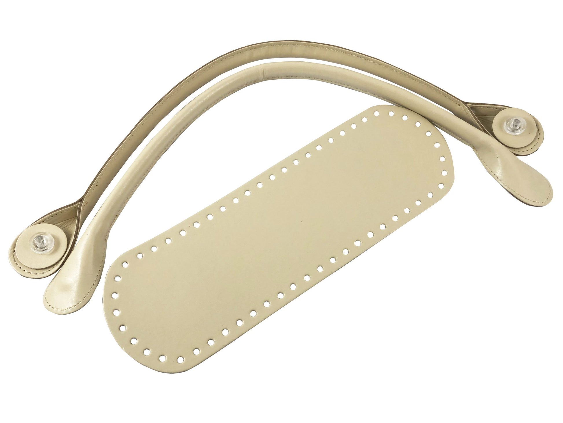 Kit o bag. Formato da fondo e manici in ecopelle, con manici innovativi con rondella da avvitare senza più cucire. I manici hanno una misura di 54 cm, il fondo ha una dimensione di 10x 30 cm.