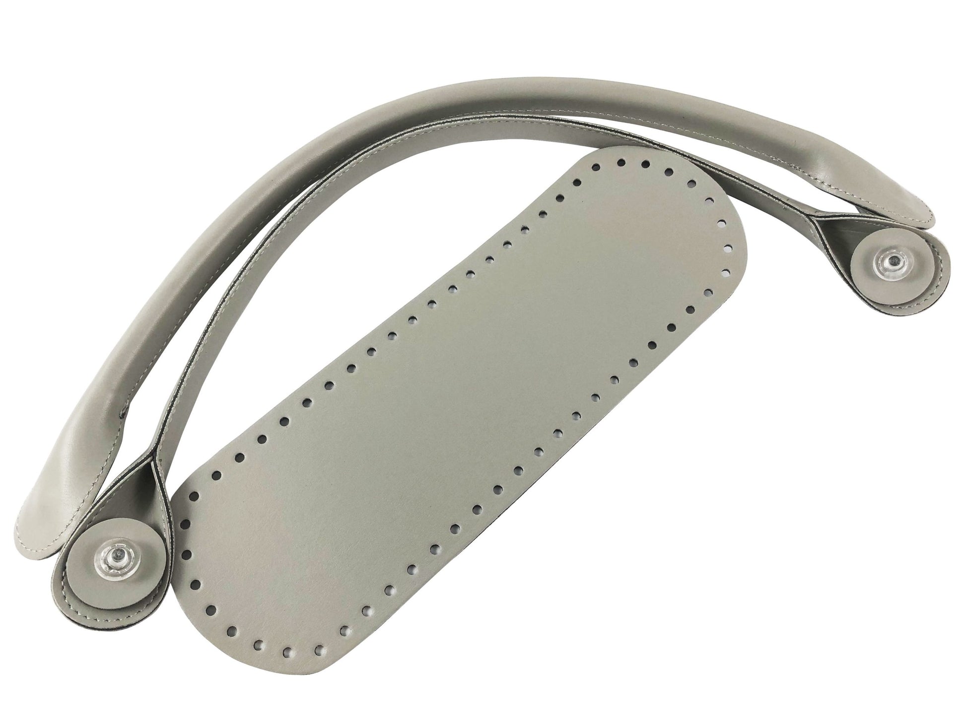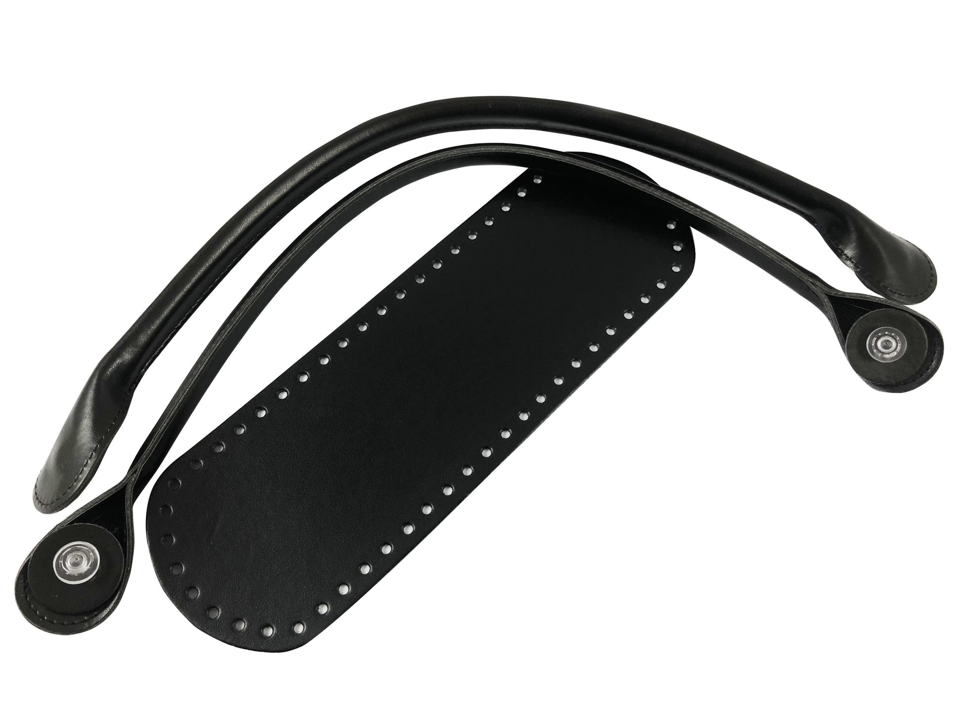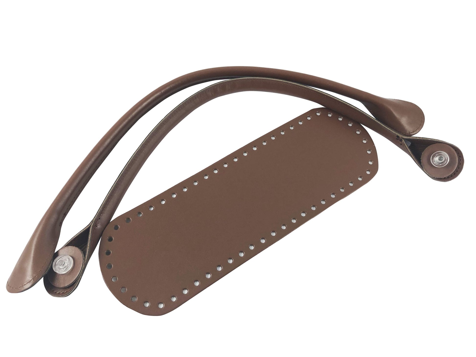 Kit o bag. Formato da fondo e manici in ecopelle, con manici innovativi con rondella da avvitare senza più cucire. I manici hanno una misura di 54 cm, il fondo ha una dimensione di 10x 30 cm.