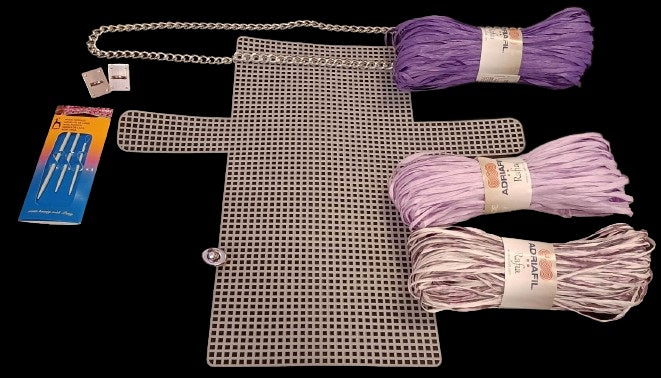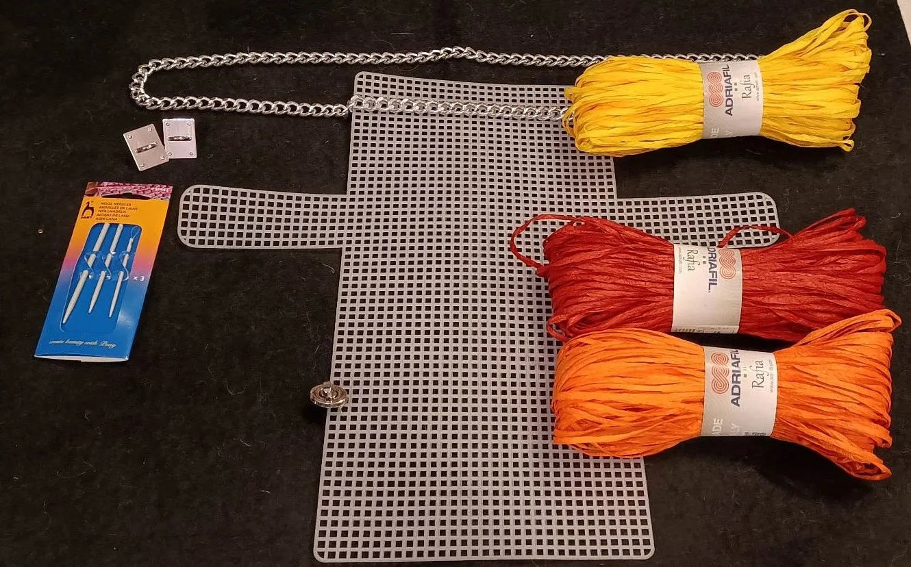 Kit rete ali con rafia: rete ali misura 50x32cm, catena 1 metro, chiusura girello, 2 ponticelli, confezione di 3 aghi, 3 gomitoli rafia morbidissima