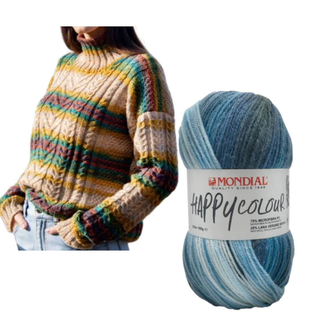 Come dice il nome Happy colour è una vera e propria esplosione di colore! Un ritorto unisex, abbastanza sottile e di facile lavorazione: si presenta con una cartella colori ampia e ricca di tonalità stampate e variegate capaci di donare una personalità unica a qualunque genere di capo, da quelli con la costruzione più semplice a capi con punti operati. Adatto alla realizzazione di maglie informali, cardigan, sciarpe e scialli di ogni genere. 75% Microfibra PC 25% Lana Merino. 100 g – 350 m. Si lavora con ferri numero 3.5 – 4.5. Si lavora con uncinetto numero 3 – 3.5