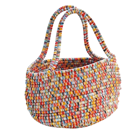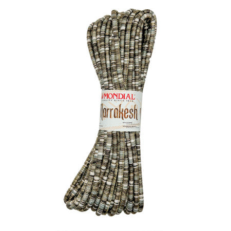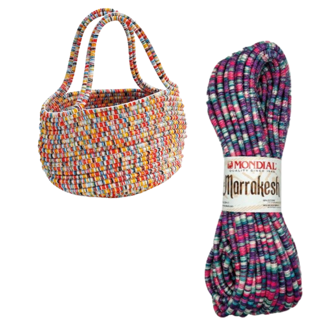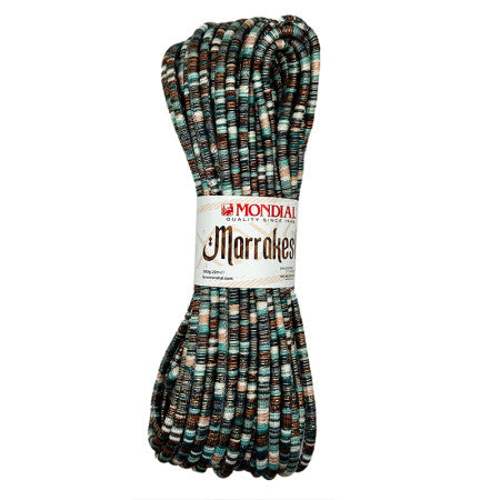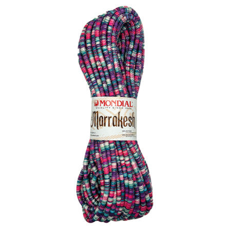 Marrakesh MONDIAL è un filo molto originale e versatile. Il suo tessuto di cotone multicolore con inserti di lamè crea uno splendido effetto a righe. Può essere utilizzato con un filo ausiliario per creare borse, cesti e sottopiatti, o da solo per bijoux. Perfetto per esprimere la tua creatività! Fatto di 60% cotone e 40% microfibra, con 300 gr e 22 metri di lunghezza.