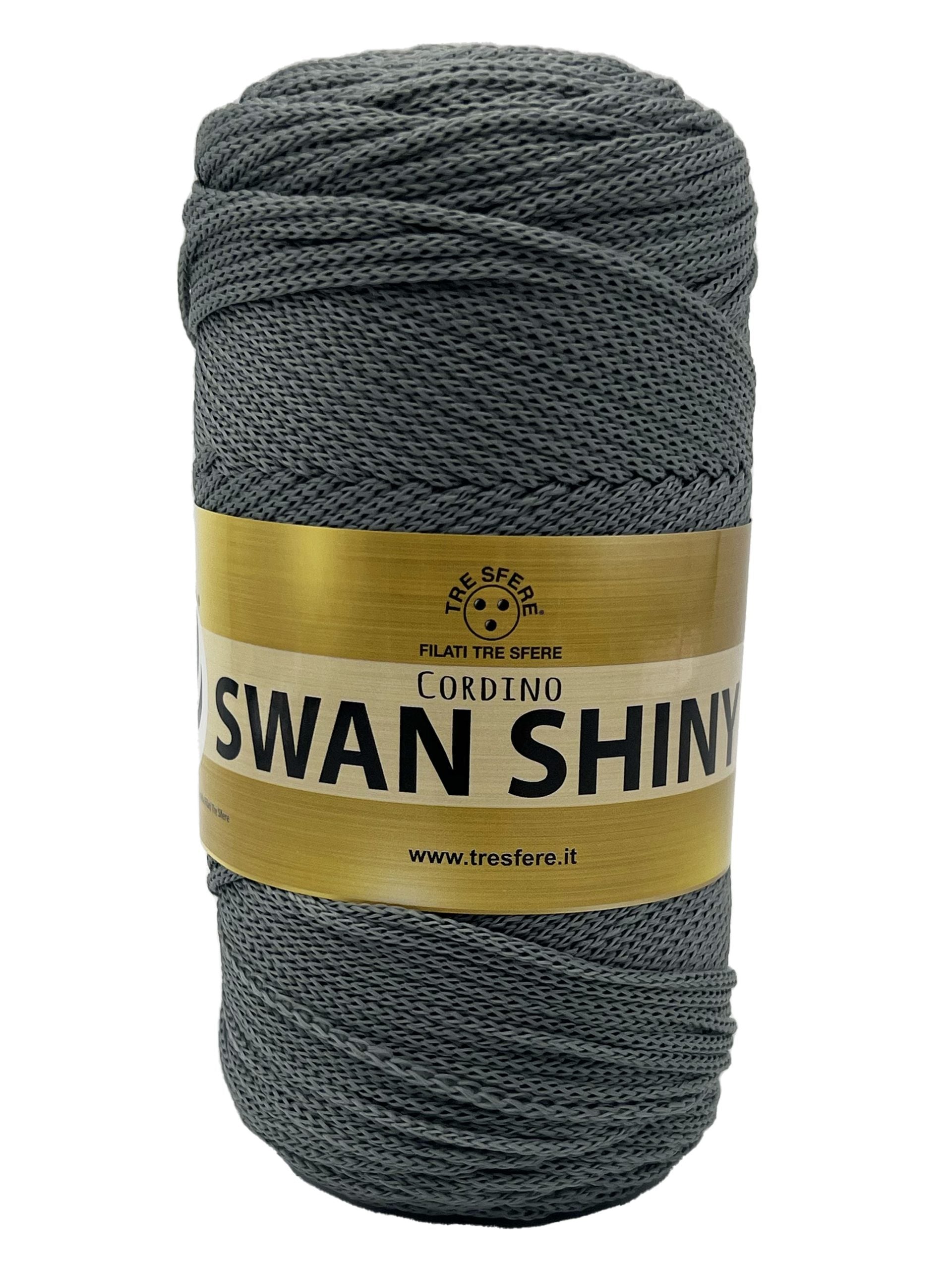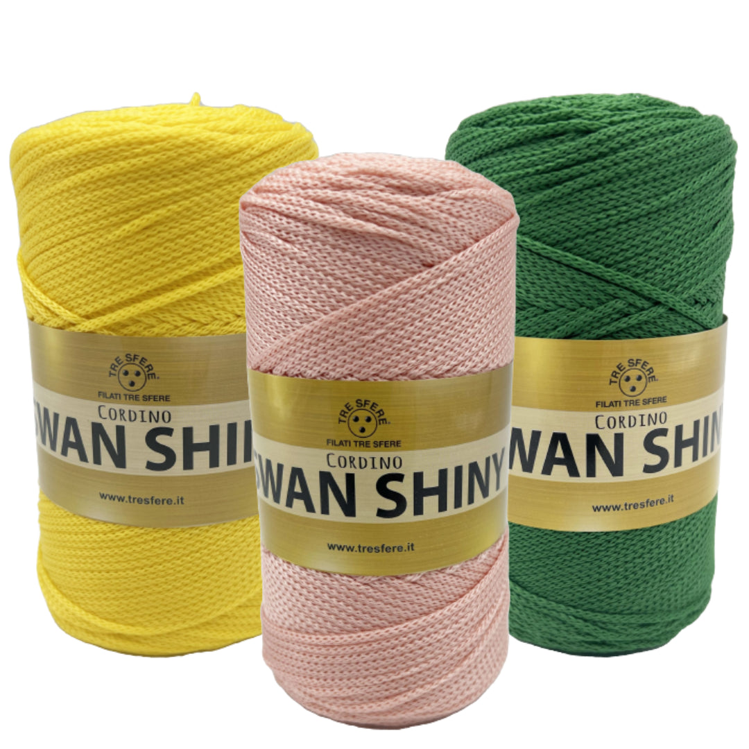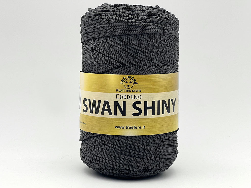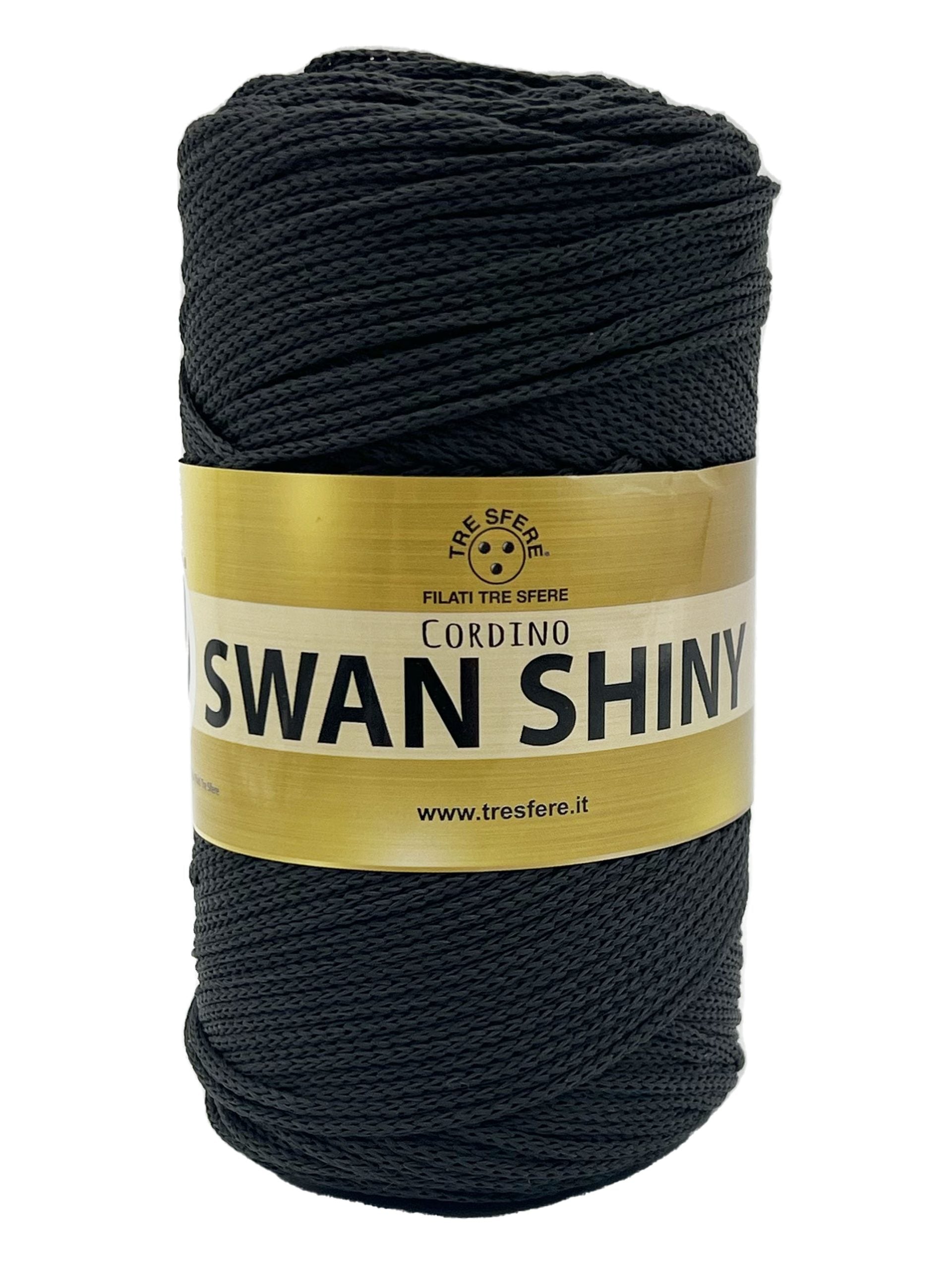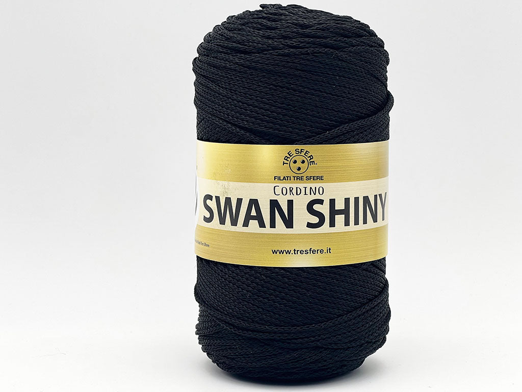 Cordino Swan Shiny, una versione più brillante del famoso Swan Black e più morbida, disponibile in rocche da 250 grammi 250 metri, spessore 2 mm, composizione 100% polipropilene, ferri uncinetti 2 mm 4 mm, fantastico per realizzare borse all’uncinetto e per lavori Handmade crochet
