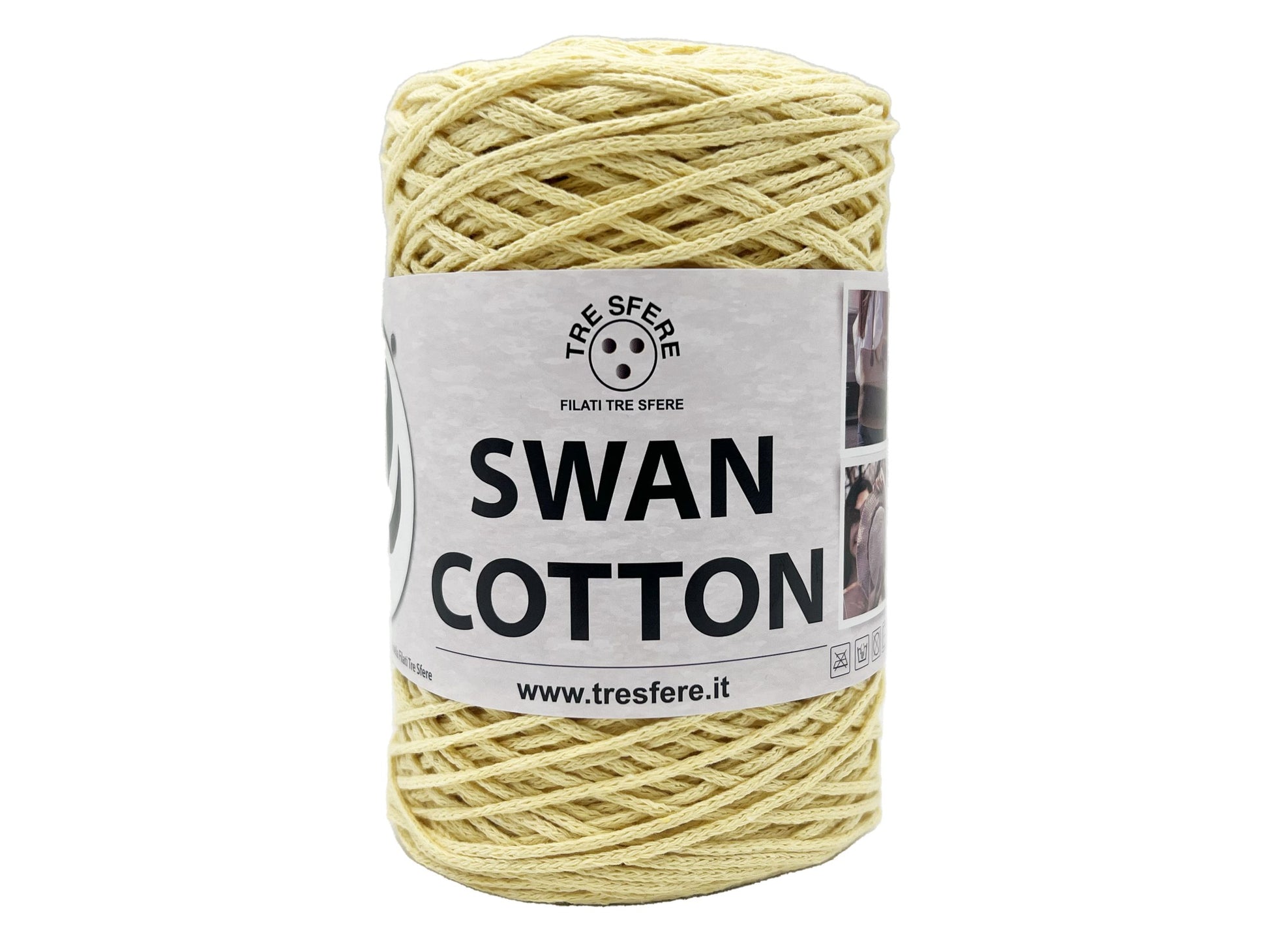 SWAN COTTON, il famoso Swan originale in una versione in cotone più morbida ed ecologica, composizione 70% cotone riciclato 30% poliestere, confezione da 250 grammi che sviluppa 250 metri, uncinetto 2-4mm ferri 2-4mm, spessore 2mm, è un prodotto di alta qualità che garantisce una resa del punto straordinaria, adatto per borse, accessori moda, accessori casa, amigurumi e molto altro.